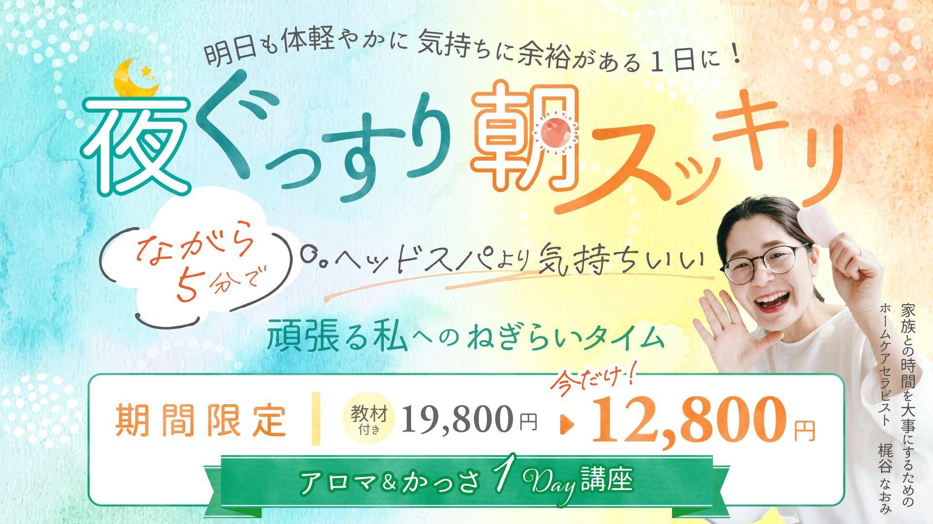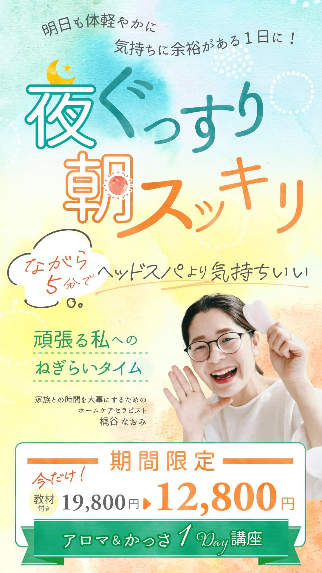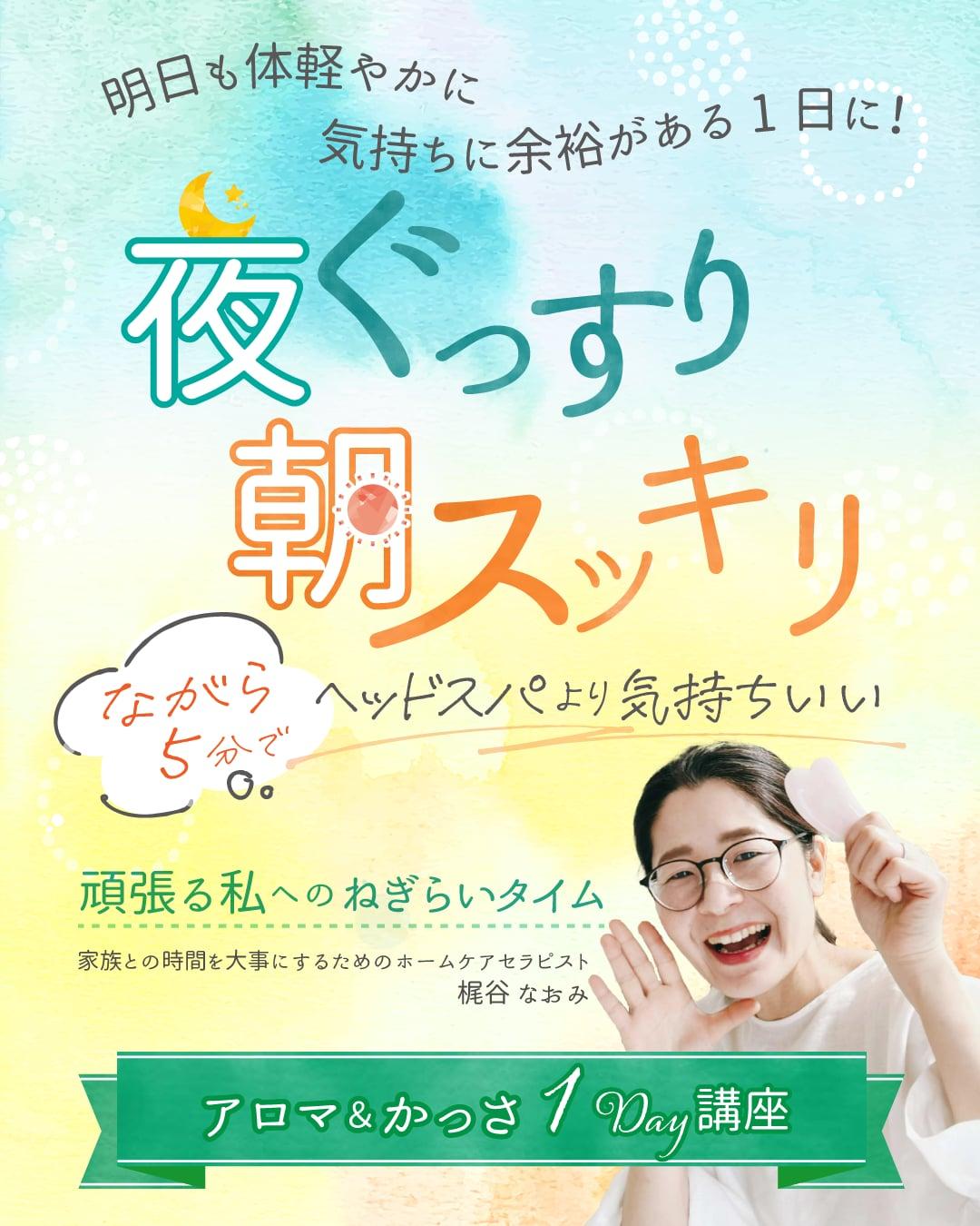アロマ&かっさでのセルフケアを始め、自分の体を整えていったことで、気持ちが整い、夫にも優しくなれるようになりました。自分のための学びだったかっさを夫にも実践したことで、夫婦関係も激変。お互いの気持ちを素直に出せて信頼できる理想の夫婦になることができました。
